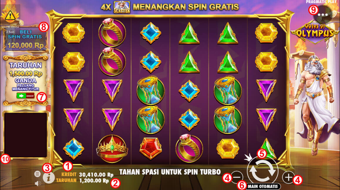 8. Fitur Buy Freespin. Fitur ini akan memunculkan Free Spin / Bonus Games secara pasti. Besaran saldo yang dibutuhkan untuk Buy Freespin adalah 100x dari nilai bettingan