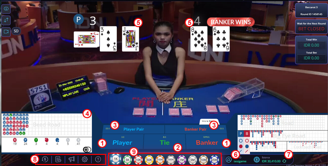 1. Player / Banker : Pemain bertaruh untuk kartu Player / Kartu Banker